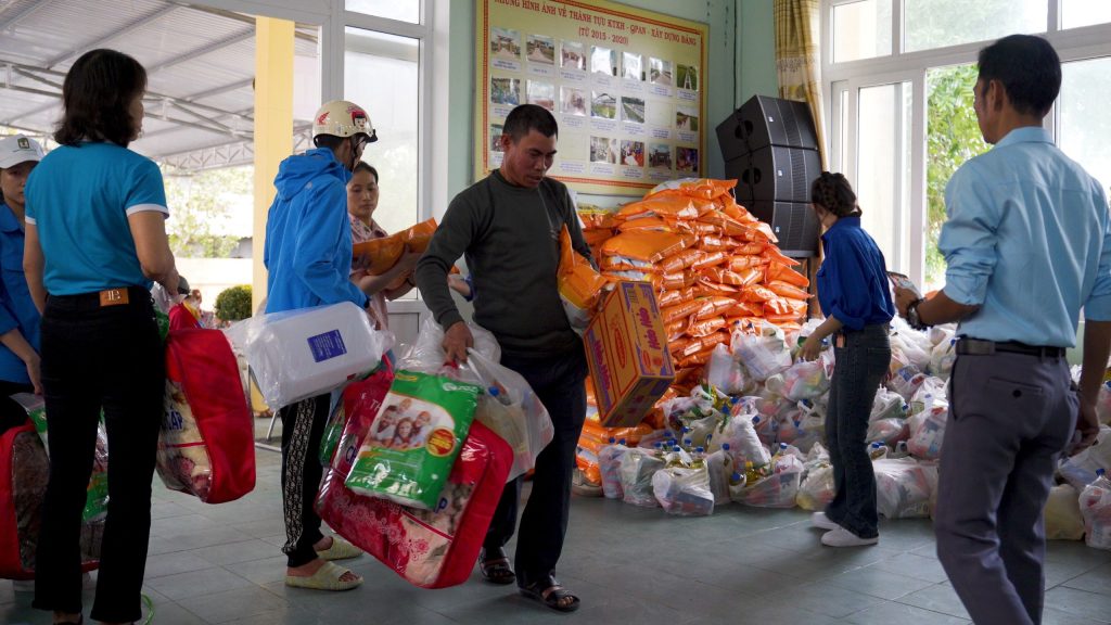 – 400 hộ nghèo và cận nghèo được nhận 400 gói thực phẩm (gạo, mì ăn liền, dầu ăn, bột nêm) và 400 bộ dụng cụ khẩn cấp (bao gồm băng vệ sinh, kem đánh răng, bàn chải đánh răng, đèn pin, còi, bột giặt, thuốc, chăn, màn chống muỗi và bình nước 20 lít)